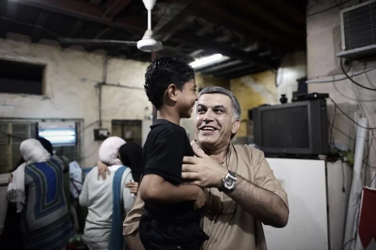 Photo: In May 2014, after he had been released following two years in prison, Nabeel Rajab carries the son of Abdul Aziz al-Abbar, a Bahraini man who died from his wounds on 23 February after he was shot during clashes between police and protesters. (AFP)