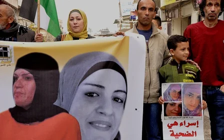 Photo: Nael Barghouthi’s wife holds his portrait during a press conference in Ramallah on 26 February 2017 (AFP)