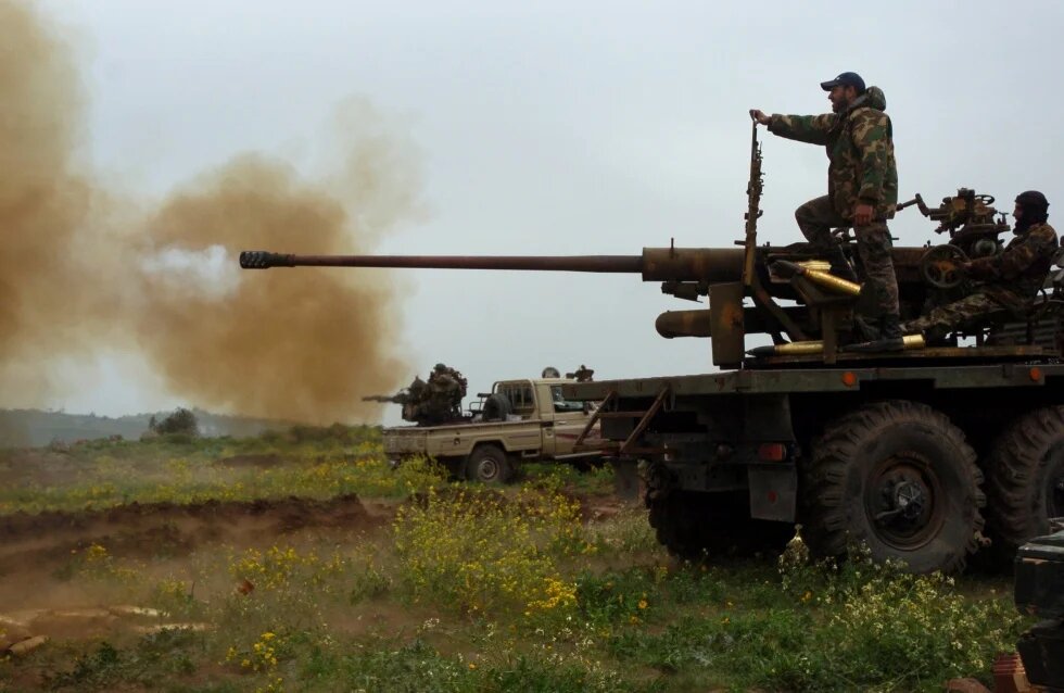 (Photo credit: Syrian forces fire a cannon and a heavy machine gun loaded on a truck during fighting against rebels in the town of Zara, in the province of Homs, on March 8, 2014 (AFP))