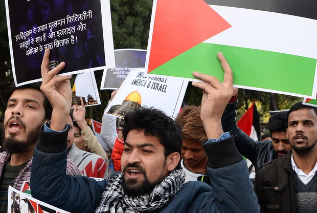 Indian Muslims hold placards during a protest rally in New Delhi on December 17, 2017, following US President Donald Trump's decision to officially recognise Jerusalem as the Israeli capital (AFP)