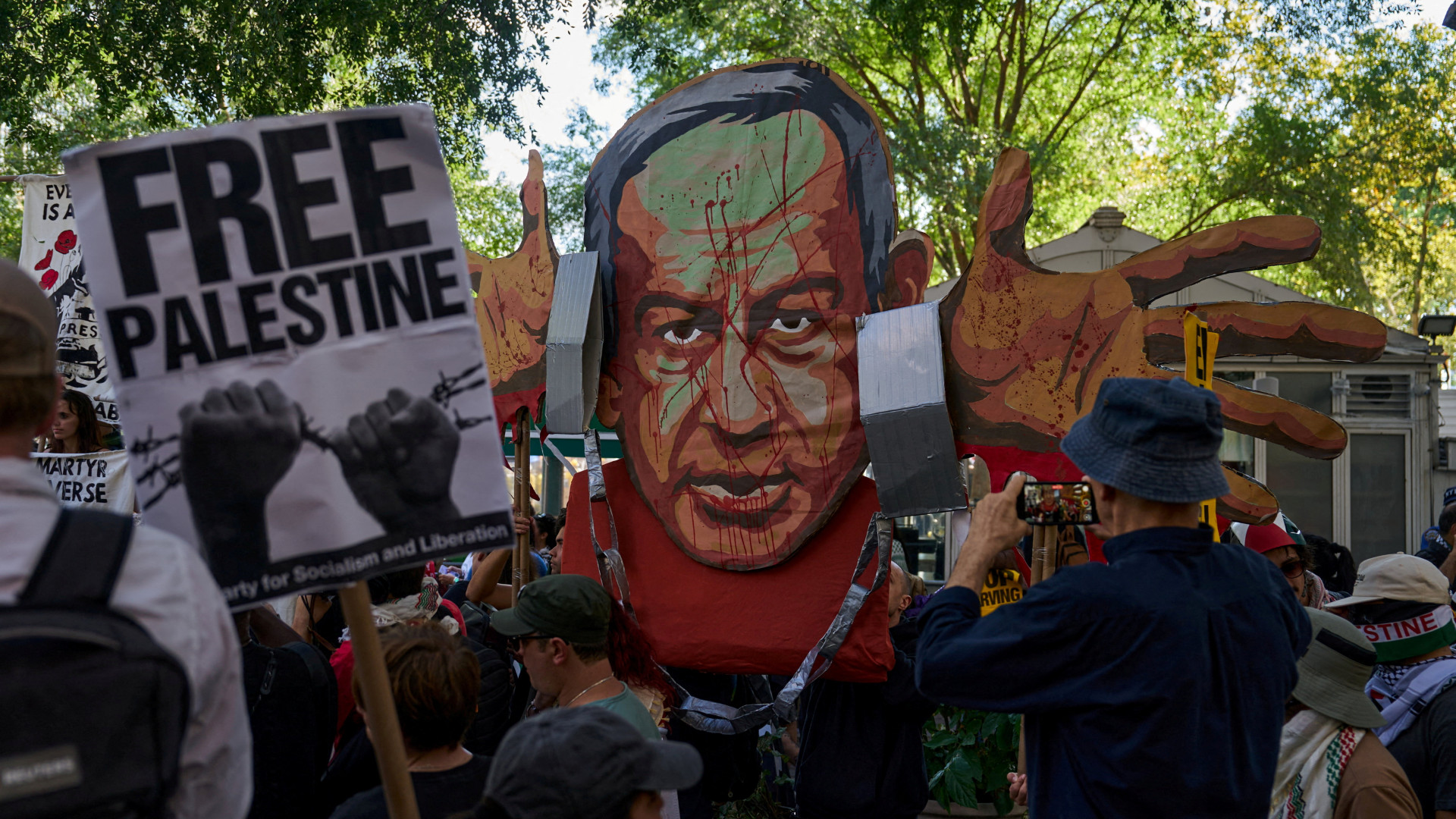 Pro-Palestinian demonstrators display an effigy of Israeli Prime Minister Benjamin Netanyahu in chains during a protest outside UN headquarters in New York, as he addressed the General Assembly, 26 September 2025 (Bing Guan/Reuters)