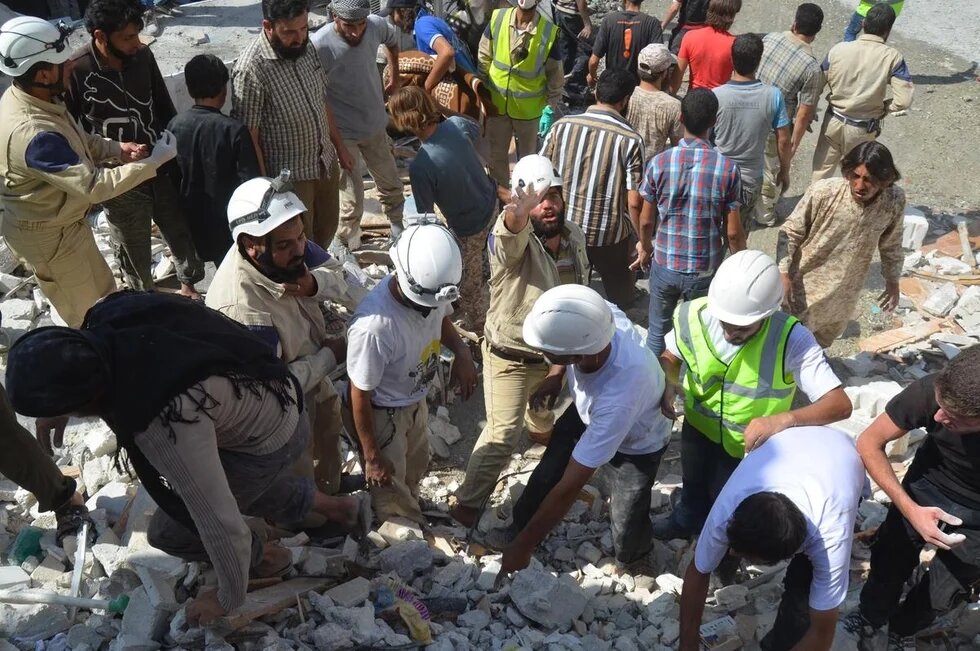 Image: Syrian search and rescue team look for the victims after Syrian attack in Ariha neighborhood in Idlib, Syria on 6 September, 2015. A separate attack carried out by Syrian army helicopters in the town of Ariha south of Idlib killed at least six others, another local civil defence source said. (AA)