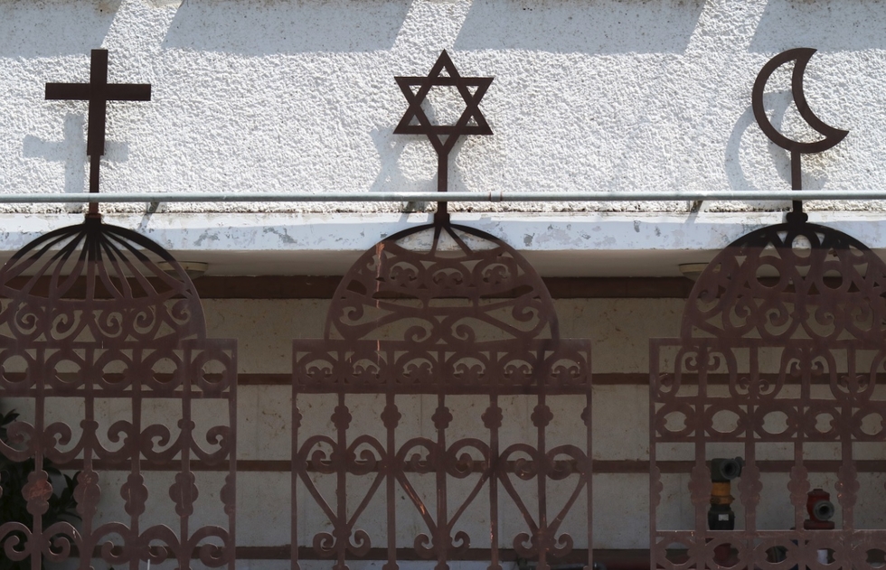 Photo: A Picture taken on 27 April, 2016 shows the symbols of the three monotheistic religions, Christianity, Judaism and Islam, on the front of an Arab Jewish centre in the northern port city of Haifa (AFP).