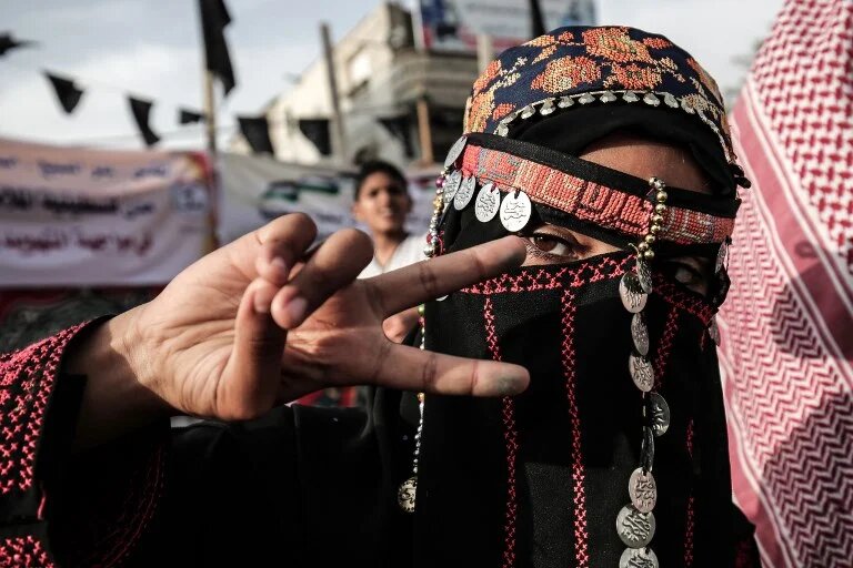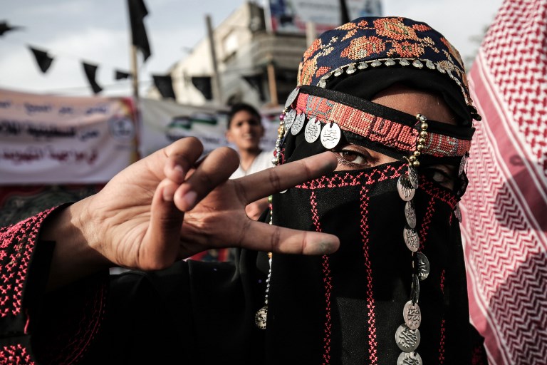 Photo: A Palestinian woman dressed in a traditional outfit poses for a picture during a rally to commemorate the 69th anniversary of the Nakba in the southern Gaza Strip in May 2017 (AFP)
