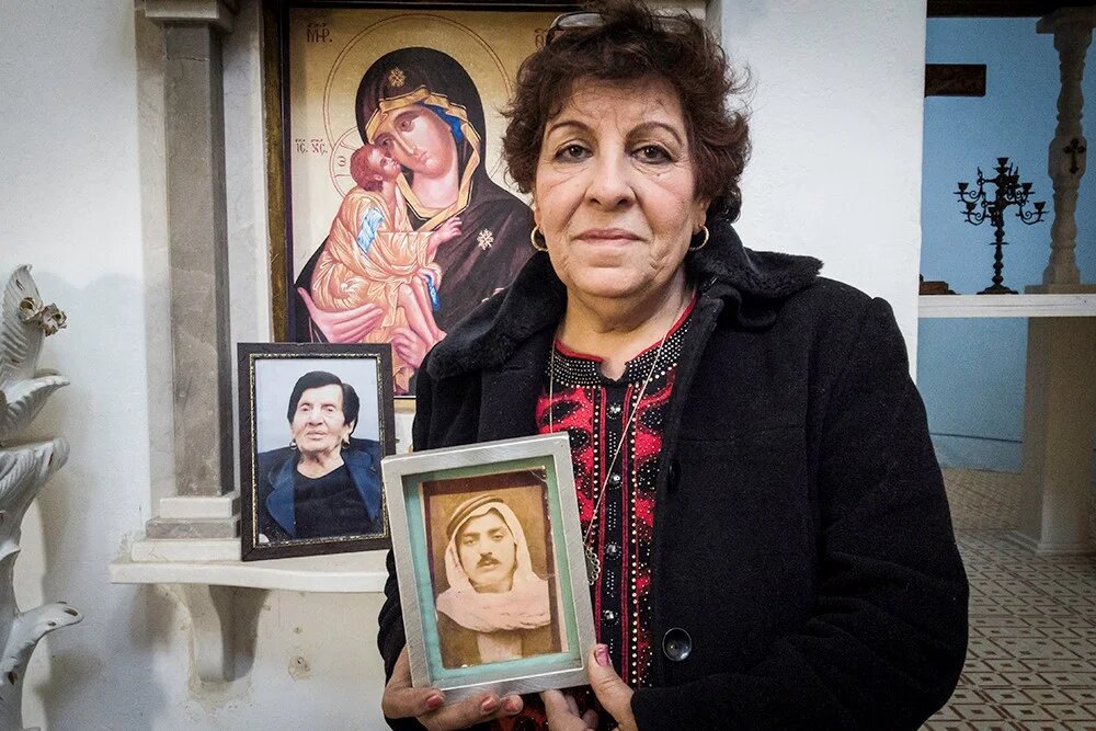 Salwa Salem Copty holds photos of her father and mother in the church in Ma'alul village (Mati Milstein)