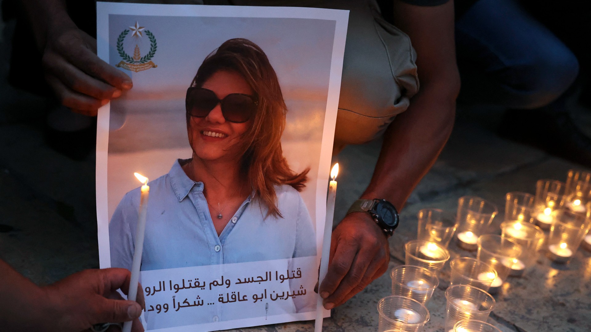 Family and friends of Al Jazeera reporter Shireen Abu Akleh attend a candle vigil outside the Church of the Nativity in the West Bank city of Bethlehem on 16 May 2022 (AFP)