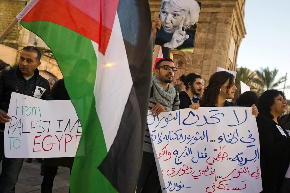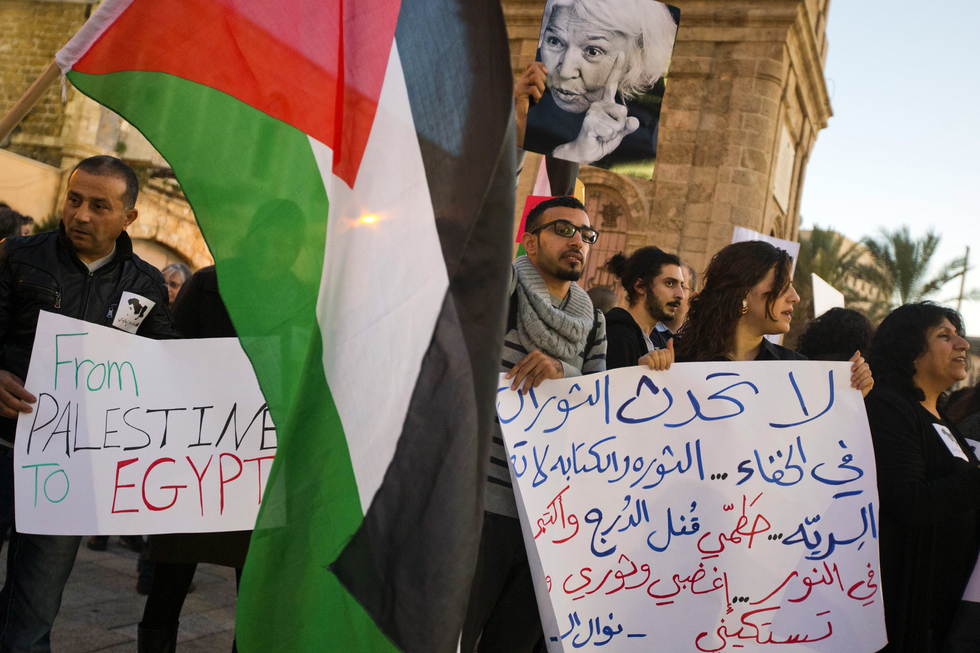 Photo: Palestinian Arab Israelis holding a picture of Egyptian feminist and leading novelist Nawal al-Saadawi, during a protest against sexual violence targeting women in Egypt, in Jaffa north of Tel Aviv, on 12 February, 2013 (AFP).