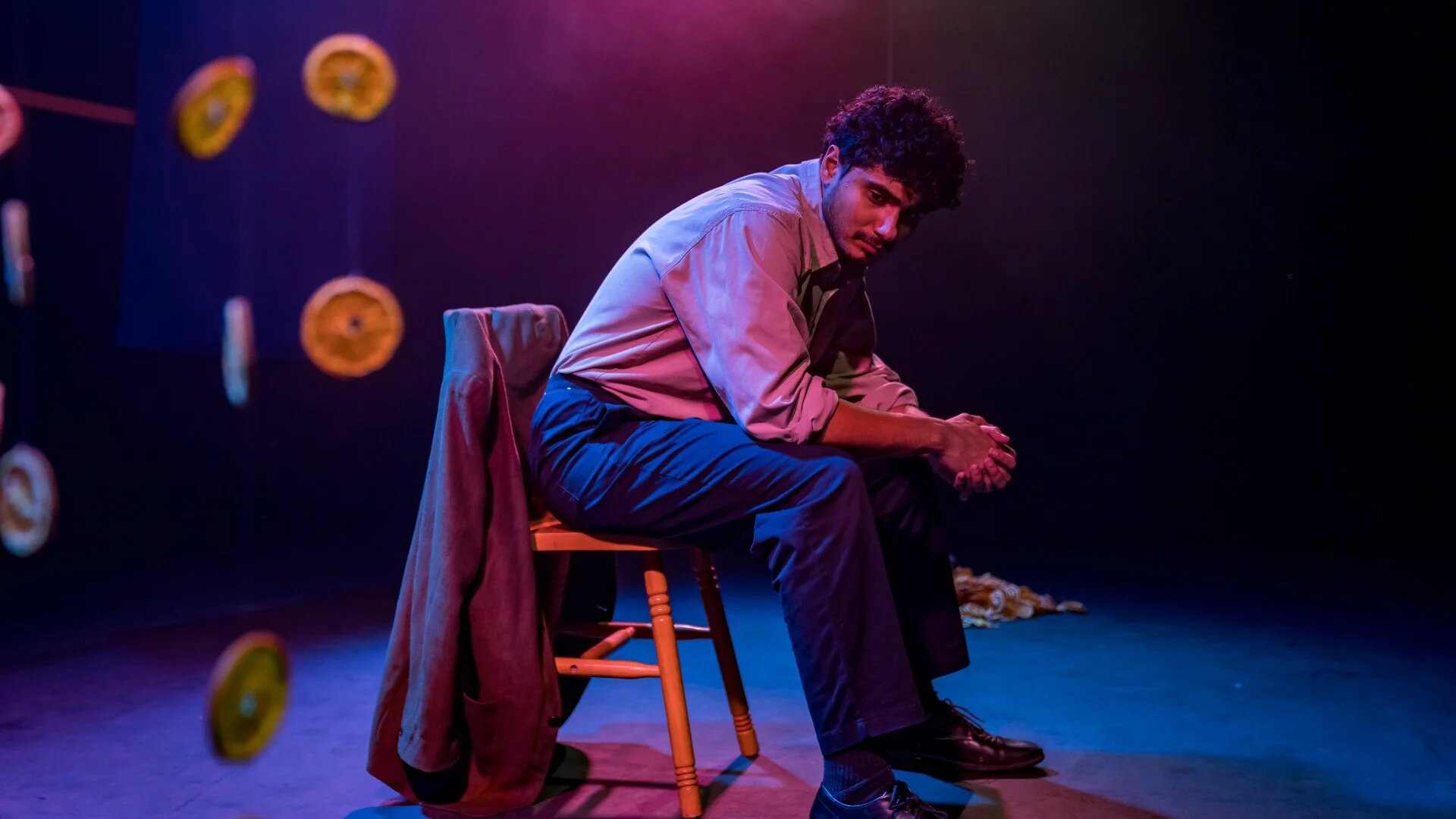 On stage, Hasna morphs into Zuaiter in 1960s Rome. He’s in his early thirties, polite and gentle, in love with a new world of Fellini, Pavarotti, Puccini, Sophia Loren and Rome’s espressos and red wine. Strings of dried sliced oranges decorate the stage as Zuaiter talks of Jaffa, oranges and growing up by the sea to a painter whose sandalled feet and a strip of yellow dress are all he can see behind a picture hanging from the ceiling.