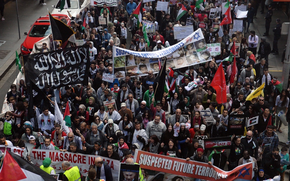 Photo Credit: Protesters hold banners and flags as they march in Sydney against Israel's military campaign in Gaza (AFP)