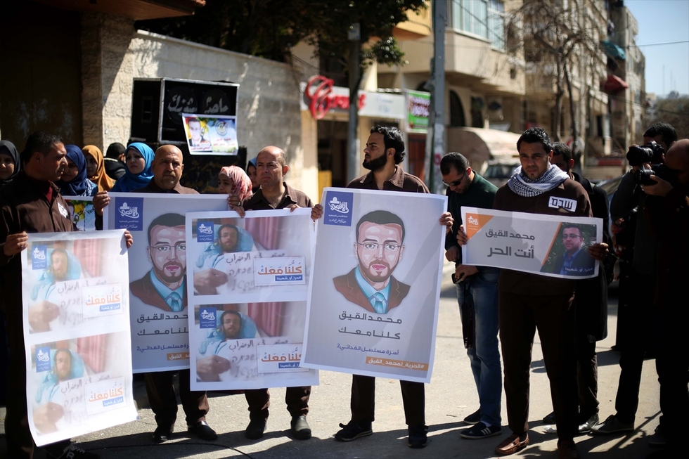 Photo: Palestinians hold posters bearing a portrait of hunger-striking journalist Mohammed al-Qiq, who is imprisoned in an Israeli jail, during a demonstration in his support outside the Red Cross building in Gaza City on 24 February, 2016 (AA).
