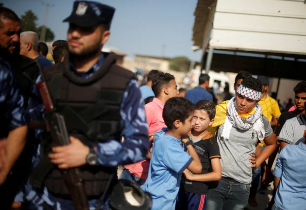 Photo: A policeman stands guard as Palestinian children wait for the arrival of Palestinian Prime Minister Rami Hamdallah and his government at Erez crossing in the northern Gaza Strip, October 2, 2017 (Reuters)