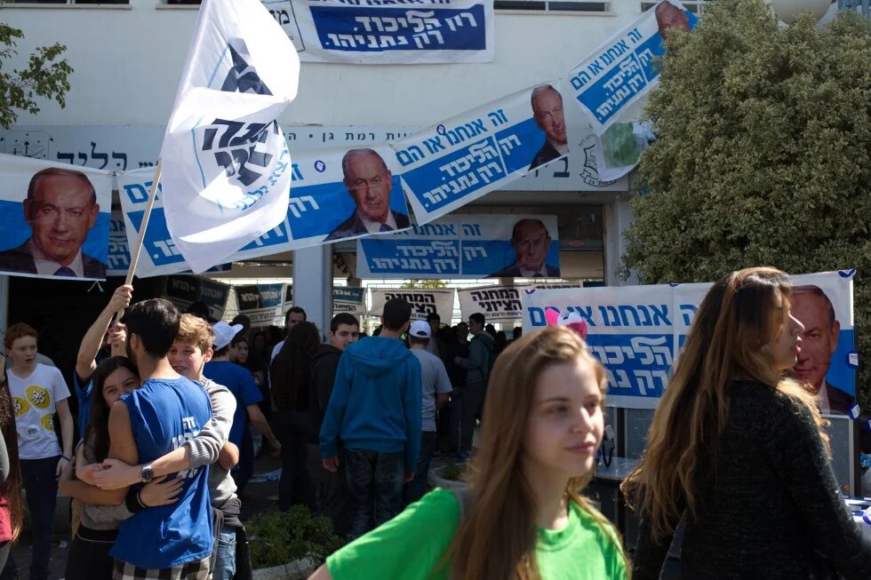 Photo: Israeli students of the Blich high school walk past Israeli Prime Minister Benjamin Netanyahu's election posters during a mock polling day in the central city of Ramat Gan on February 22, 2015.