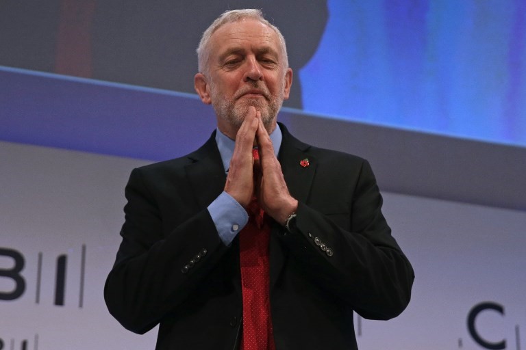 Photo: Britain's opposition Labour Party leader Jeremy Corbyn, gestures as he addresses delegates at the annual Confederation of British Industry (CBI) conference in east London, on 6 November 2017 (AFP)