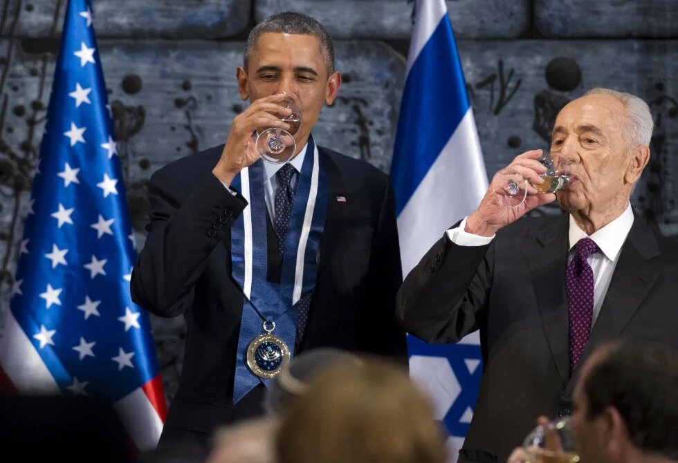 Photo credit: Israeli President Shimon Peres (R) and US President Barack Obama drink wine during a toast (AFP)