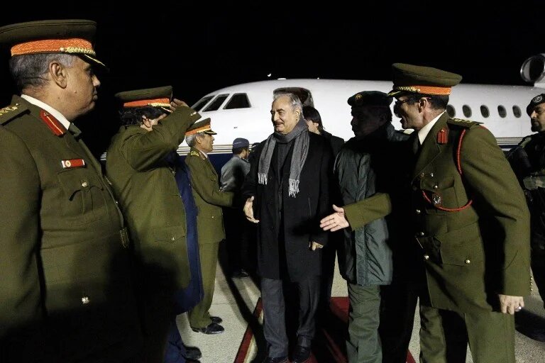 Photo: General Khalifa Haftar (C), commander of the armed forces loyal to the internationally recognised Libyan government, is greeted upon his arrival at Al-Kharouba airport south of the town of al-Marj, about 80 km east of the Mediterranean port city of Benghazi on 3 December 2016 after a visit to Russia (AFP)