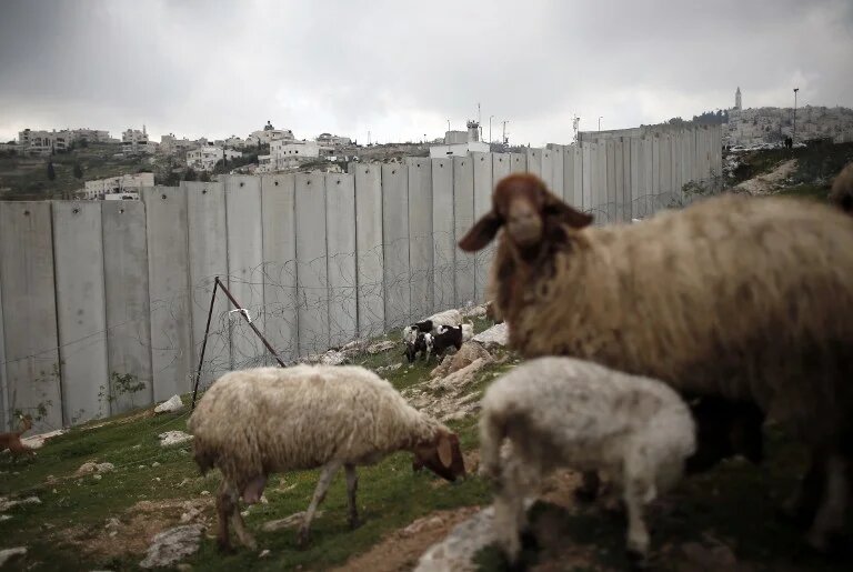 Image: Sheep graze near Israel's controversial separation barrier dividing the Palestinian neighbourhood of Al-Tur in the Israeli annexed East Jerusalem with the West Bank, on 11 February 2016 (AFP)