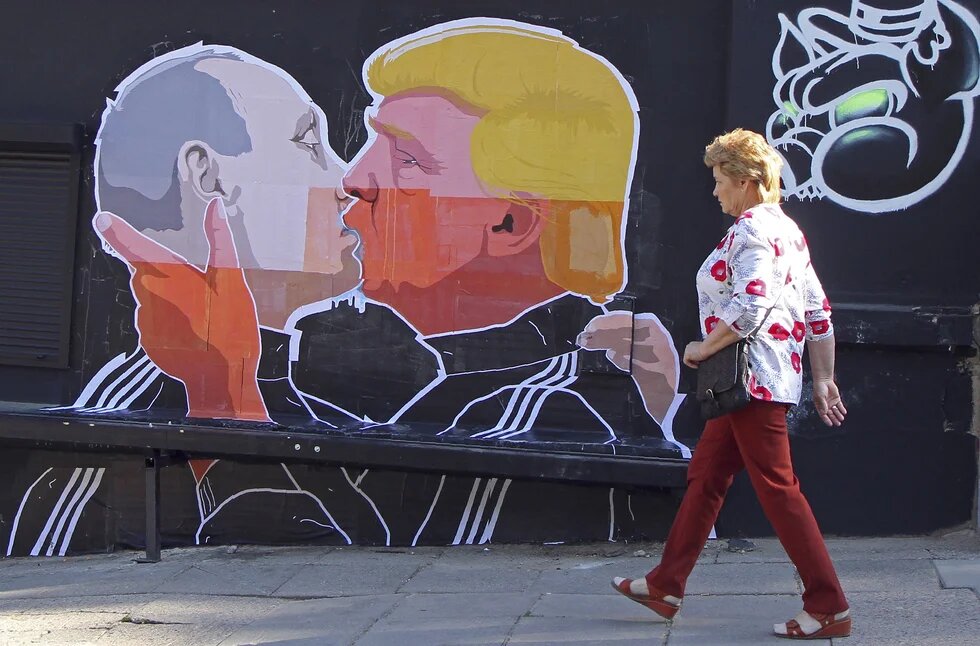 Photo: A woman walks past a mural on a restaurant wall depicting US Presidential hopeful Donald Trump and Russian President Vladimir Putin greeting each other with a kiss in the Lithuanian capital (AFP)