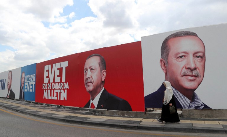 Photo: A woman walks past a giant poster bearing portraits of Turkish President Recep Tayyip Erdogan on 11 April 2017 in Ankara, ahead of the referendum on whether to change the current parliamentary system into an executive presidency (AFP).
