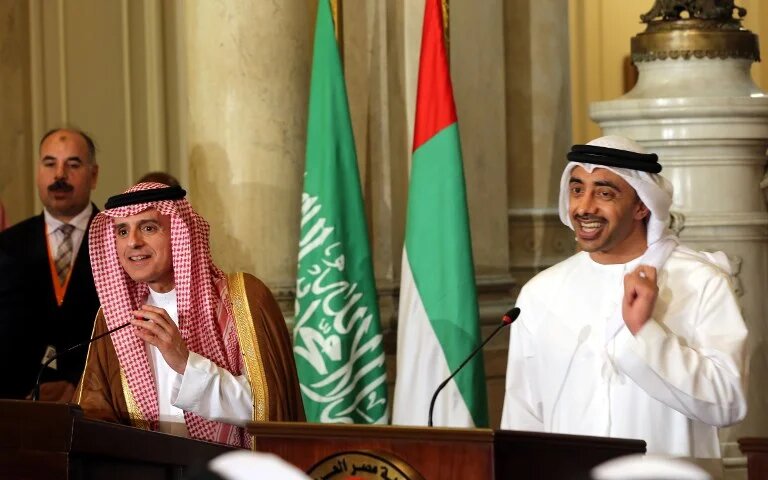 Photo: UAE Minister of Foreign Affairs and International Cooperation Abdullah bin Zayed Al-Nahyan (R) talks to reporters as he stands next to Saudi Foreign Minister Adel al-Jubeir, during a joint press conference with their Egyptian and Bahraini counterparts after their meeting in the Egyptian capital Cairo on 5 July 2017, discussing the Gulf diplomatic crisis with Qatar (AFP)