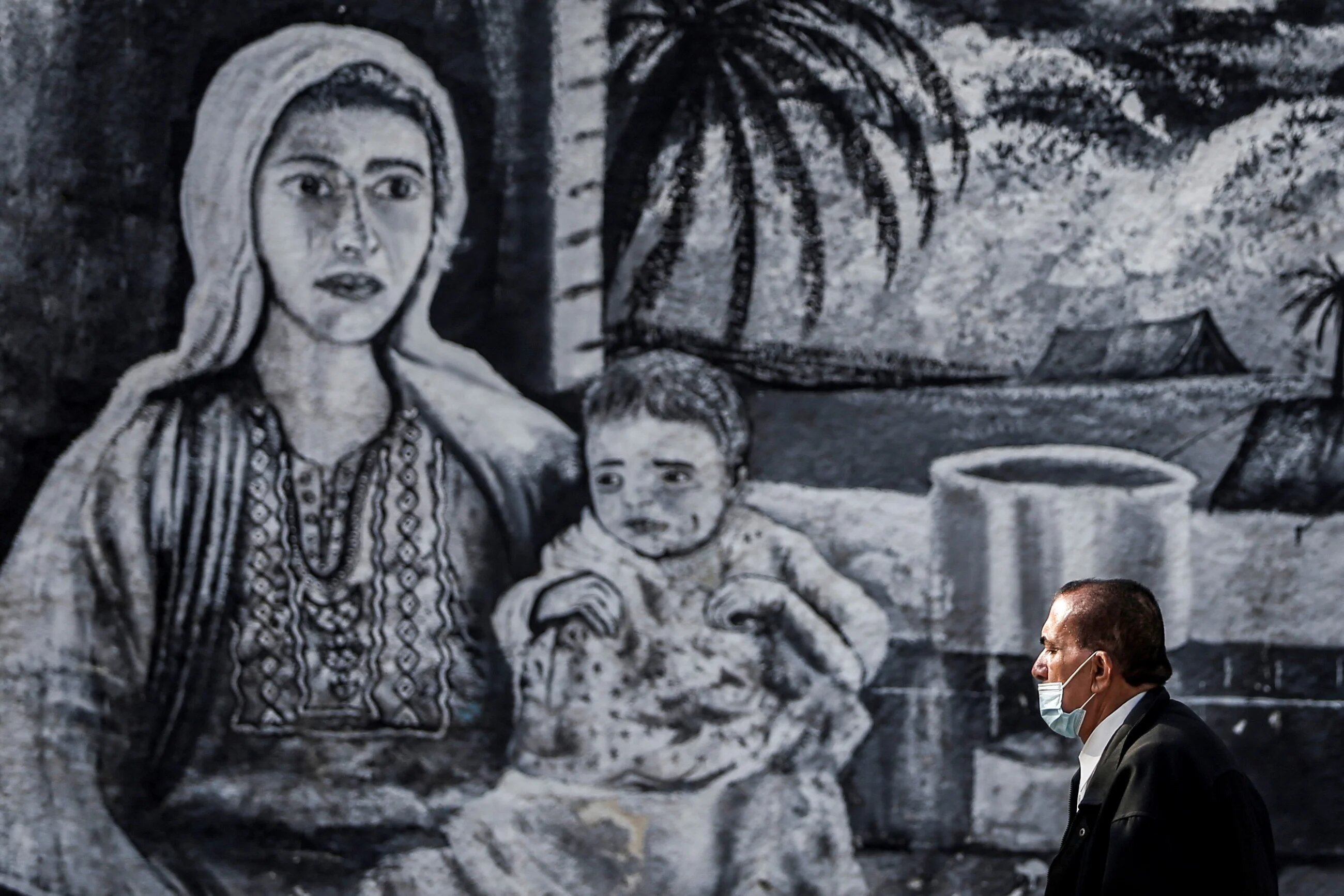 A Palestinian man walks past a mural about Palestinian refugees drawn on a wall along a street in Gaza City on 8 November (AFP)