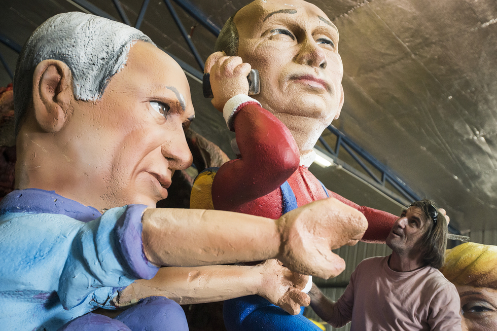 Photo: An artist stands next to effigies of Israeli Prime Minister Benjamin Netanyahu (L) and Russian President Vladimir Putin, during preparations for the Jewish festivities of Purim, on 10 February, 2014 in the Israeli central town of Jaljulia (AFP).