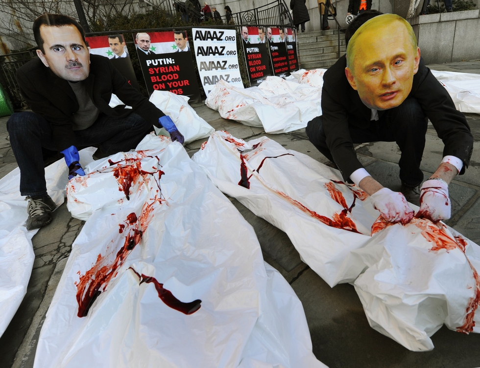 Photo: Actors from Avaaz wearing masks of Syria's Bashar al-Assad and Russia's Vladimir Putin protest using dozens of fake bloodied body bags outside the UN Security Council building on 24 January, 2012 (AFP).