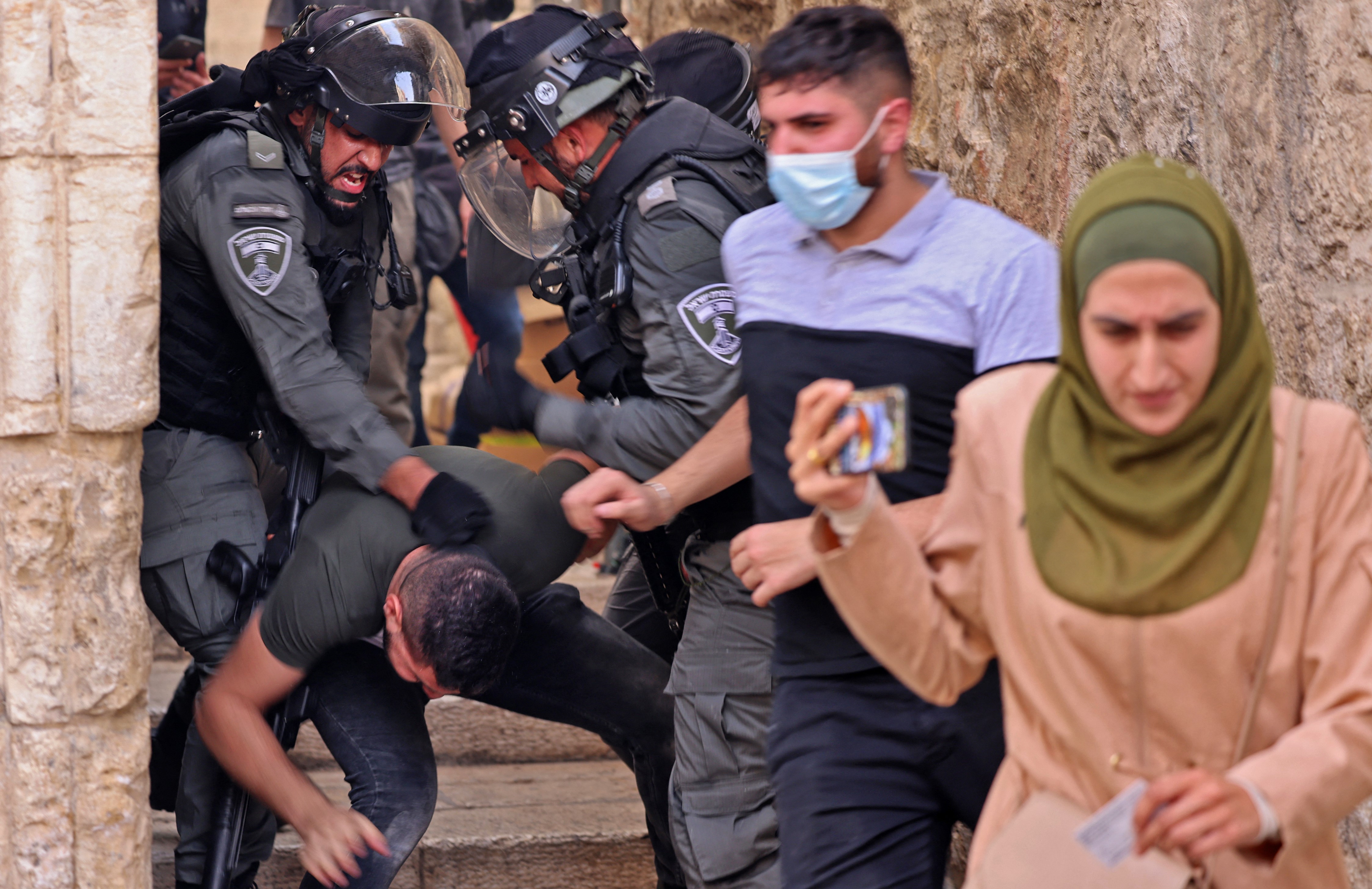 Israeli occupation forces detain a peaceful Palestinian protester in Jerusalem's Old City on 10 May, 2021(AFP)