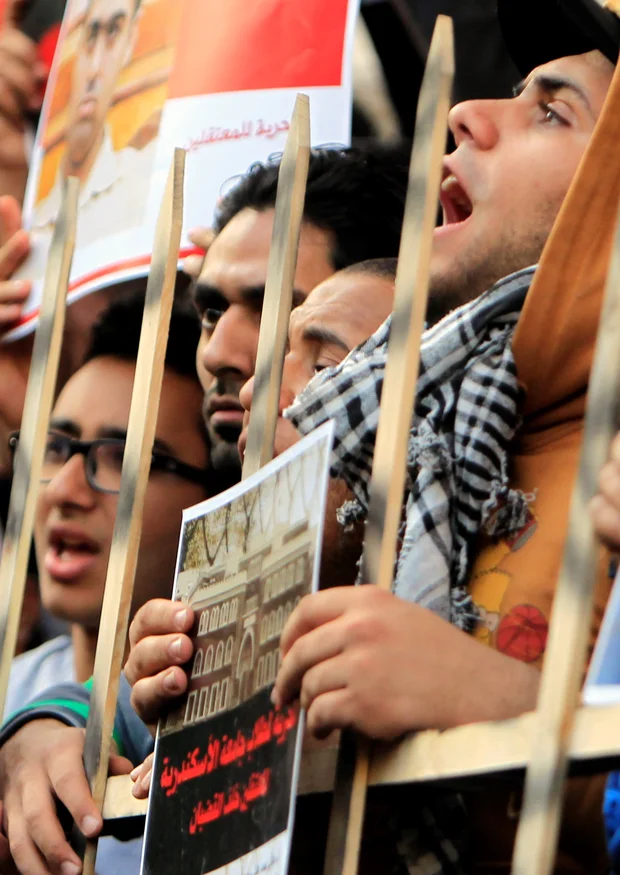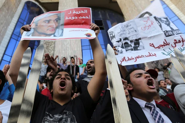 Members of the April 6 movement shout slogans with activists against the government as they protest against the detention of several members of their movement (REUTERS/Mohamed Abd El Ghany)
