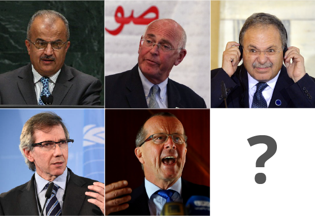 Photo: From L to R on top: Abdelelah al-Khatib, Ian Martin and Tarek Mitri. From L to R on bottom: Bernadino Leon, Martin Kobler (All photos from AFP).