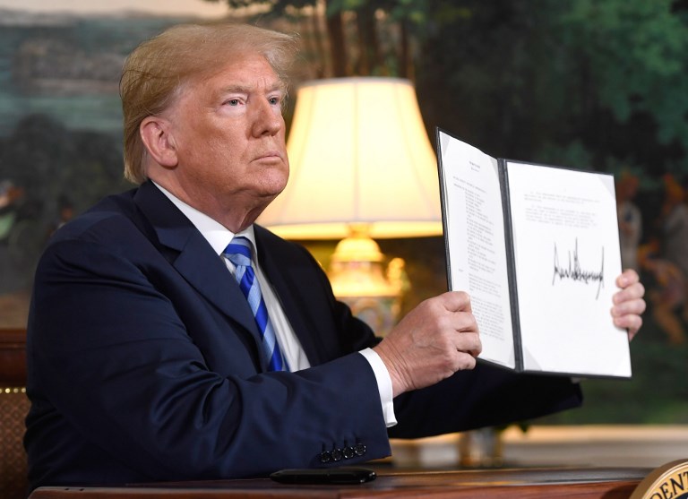Photo: US President Donald Trump signs a document reinstating sanctions against Iran in Washington on 8 May 2018 (AFP)