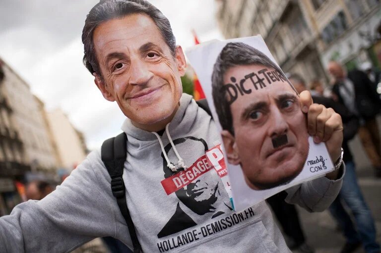 Photo: A man wearing a mask depicting former French president Nicolas Sarkozy holds a picture of Manuel Valls during a demonstration against the French government's planned labour law reforms on May 19, 2016 in Marseille. (AFP)