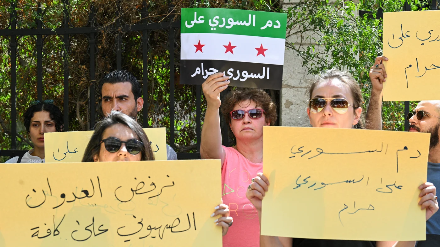 Syrians protest sectarian clashes and Israeli strikes, denouncing efforts to divide the country along ethnic and sectarian lines amid attacks in Sweida, outside parliament in Damascus on 16 July 2025 (Louai Beshara/AFP)