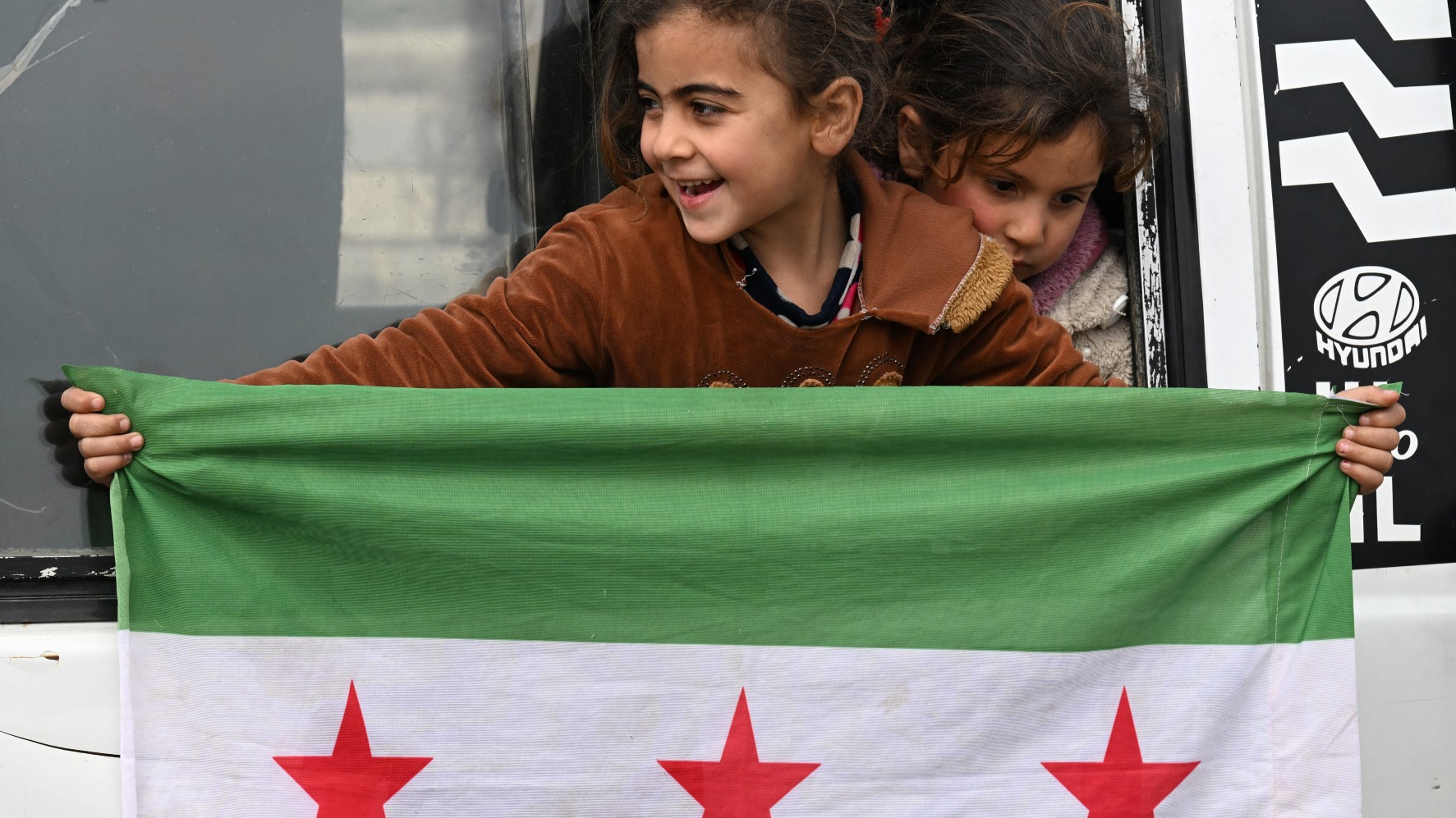 A girl holds an independence-era Syrian flag out of the window of a bus carrying displaced Syrians returning home after years of displacement on 10 February 2025 (AFP)