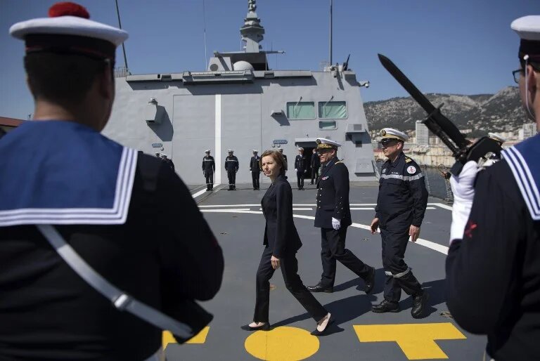 Photo: French Defence Minister Florence Parly reviews the troops onboard the FREMM Languedoc in Toulon, France, a week after tripartite strikes against Syria’s regime in response to a suspected chemical weapons attack (AFP).