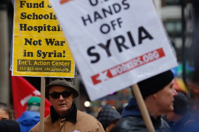 Photo: A man holds a placard during an anti-war protest after President Donald Trump launched air strikes in Syria, 15 April, 2018 in New York City. United States, United Kingdom, and France conducted strikes in Syria in response to the alleged use of chemical weapons (AFP).