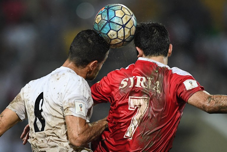 Photo: Omar Khrbin of Syria (R) and Morteza Pouraliganji of Iran head the ball during the 2018 World Cup qualifying football match between Syria and Iran at Tuanku Abdul Rahman Stadium in Seremban on 15 November 2016 (AFP).