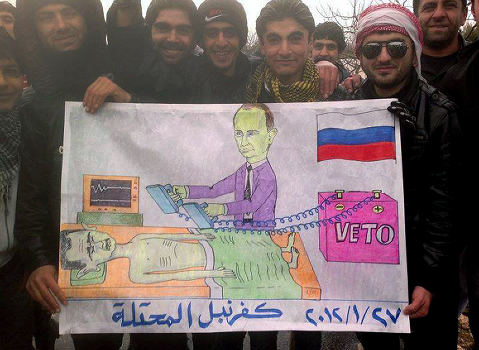 Photo: Anti-government Syrians in the northwestern town of Kfar Nubul in Idlib province on 27 January, 2012 carrying a cartoon depicting the Russian leader Vladimir Putin defibrillating Syrian President Bashar al-Assad by using a veto vote to block a UN Security Council resolution against Damascus (AFP/HO/ Local Coordination Committees of Syria).
