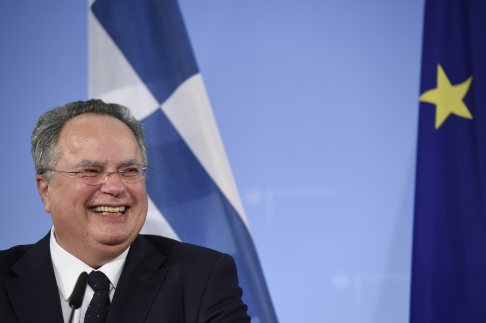 Photo: Greece's Foreign Minister Nikos Kotzias laughs as he addresses a press conference with his German counterpart following talks at the foreign ministry in Berlin on 10 February (AFP)