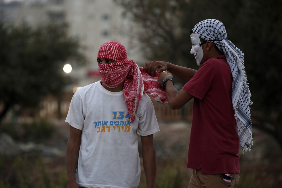 Photo: A Palestinian youth helps another put on a scarf during clashes with Israeli soldiers close to the illegal Jewish settlement of Bet El, in the occupied West Bank city of Ramallah on 4 October, 2015 (AFP).