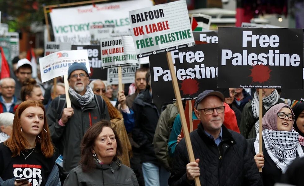 Photo: Demonstrators marching for Palestine solidarity head towards Parliament Square, in central London, Britain 4 November 2017 (Reuters)