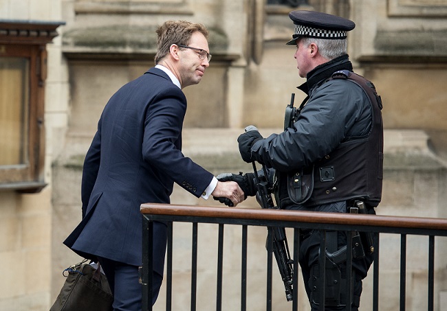 Photo: British Conservative Party politician Tobias Ellwood (L), who gave first aid to the fatally wounded police officer Keith Palmer, one of the casualties of the 22 March London terror attack, shakes hands with an armed police officer as he arrives at the Houses of Parliament in London on 24 March 2017 (AFP)