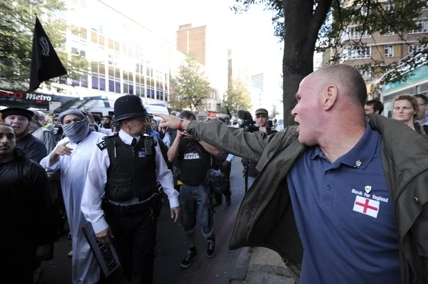 A member of the right-wing English Defence League shouts at police escorting Muslim demonstrators in London on 11 September 2011 (AFP)