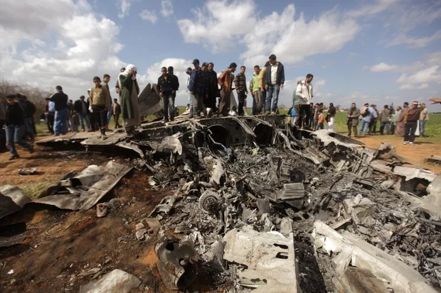 Libyans gather around the wreckage of a US F-15 fighter jet near Benghazi in March 2011 after crashing while on a mission against Muammar Gaddafi's air defences (AFP)