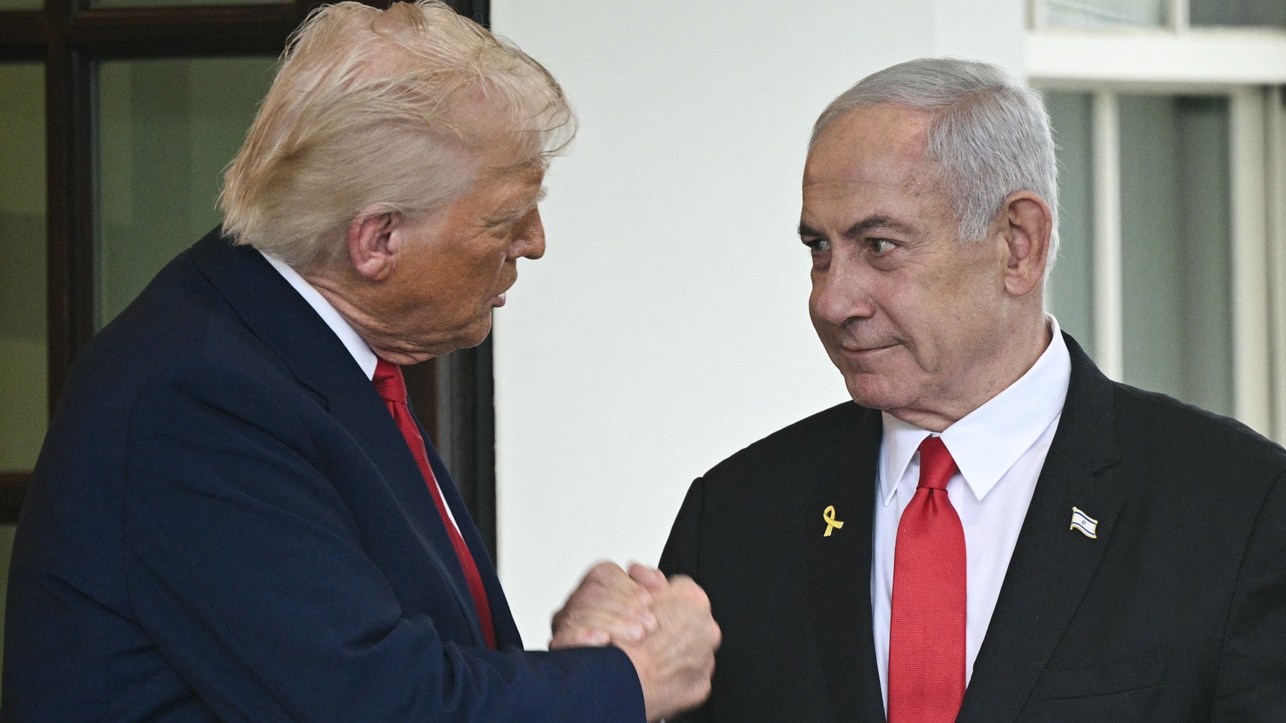 US President Donald Trump shakes hands with Israeli Prime Minister Benjamin Netanyahu as Netanyahu departs the White House in Washington, DC, on 7 April, 2025 (AFP)