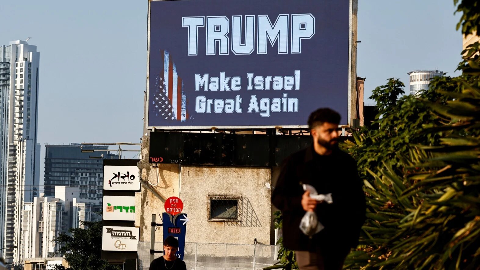 A billboard shows a slogan in support of US President Donald Trump in Tel Aviv, Israel, on 5 November 2024 (Reuters)