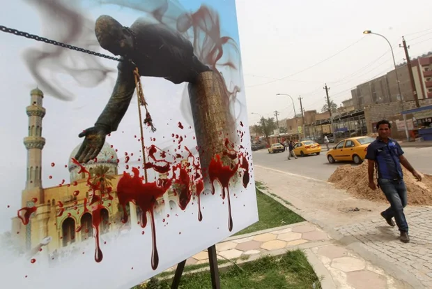 An Iraqi man walks past a billboard depicting the fall of executed dictator Saddam Hussein's statue in Baghdad, 2013 (AFP)