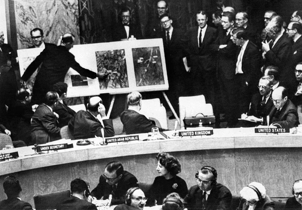 US officials at the UN Security Council shows aerial views of Cuba during the missile crisis of 1962 (AFP/file)