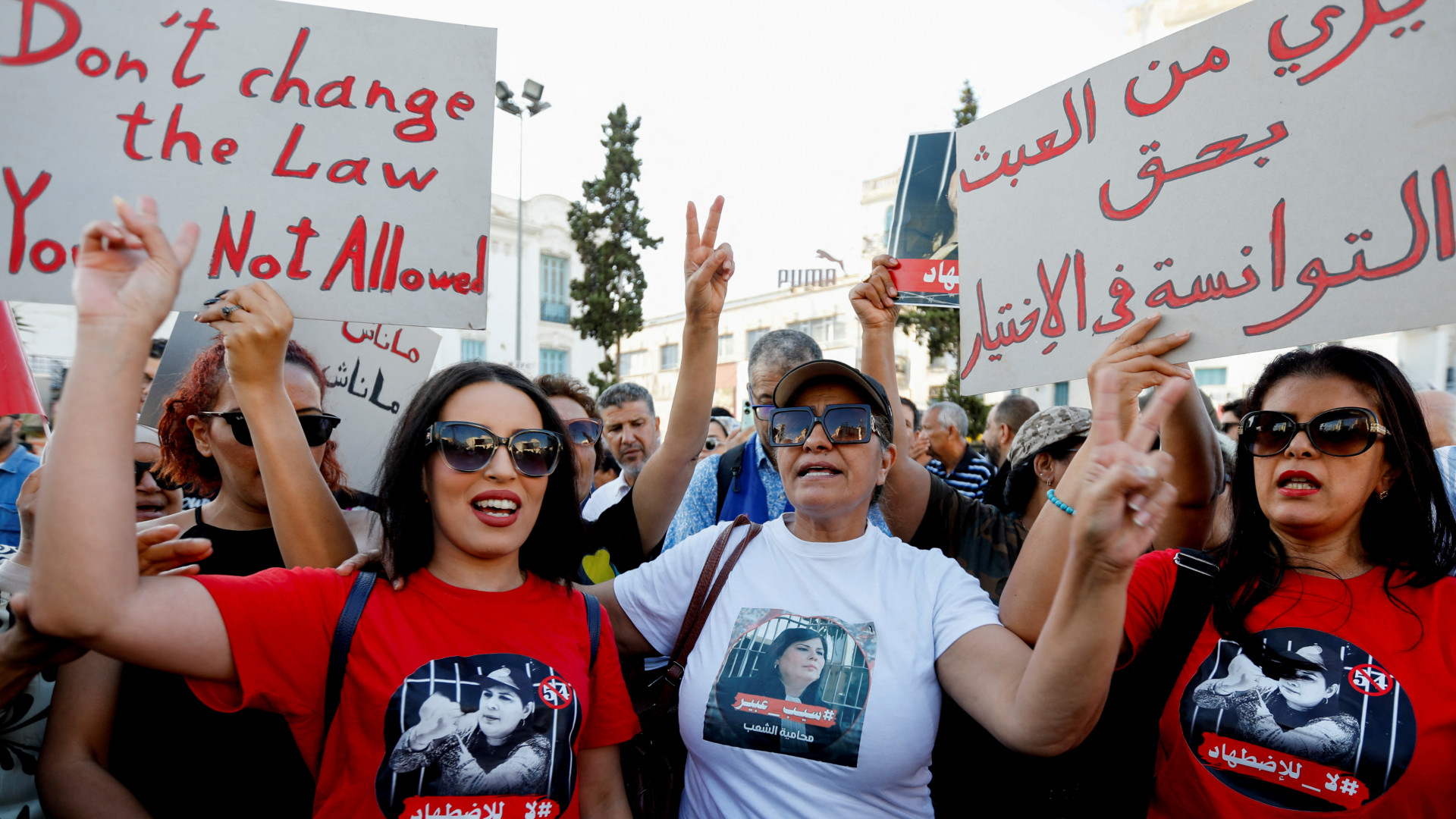 Demonstrators hold up placards during a protest against Tunisia’s President Kais Saied, two days before the presidential election, in Tunis on 4 October 2024 (Zoubeir Souissi/Reuters)