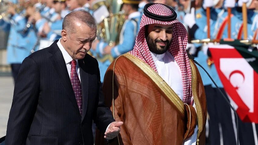 Turkish President Recep Tayyip Erdogan welcomes Saudi Crown Prince Mohammed bin Salman in Ankara on 22 June 2022 (AFP)