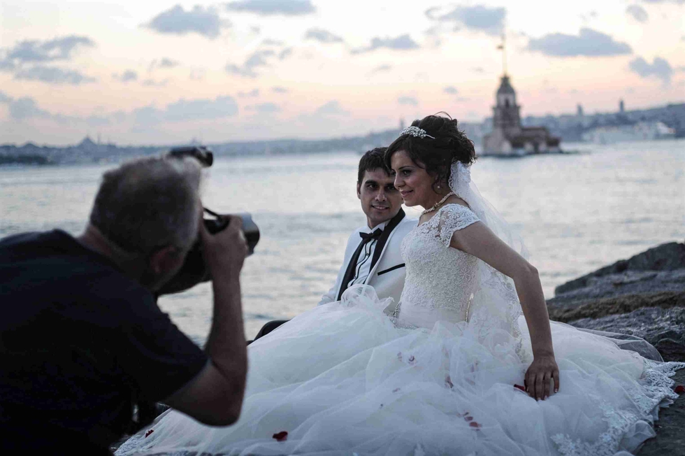 Photo: A newly married couple poses for wedding pictures in front of the Maiden's Tower in August 2013 in Istanbul (AFP